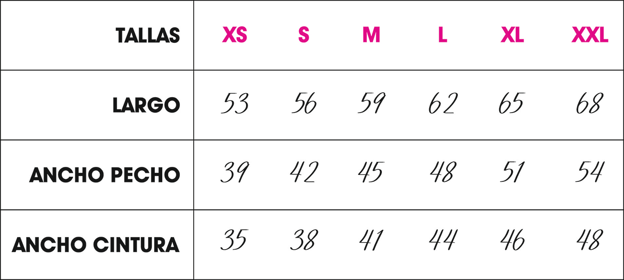 * Tabla de medidas, detallada en cm. Puede existir una variación de algunos centímetros, las medidas indicadas son aproximadas.